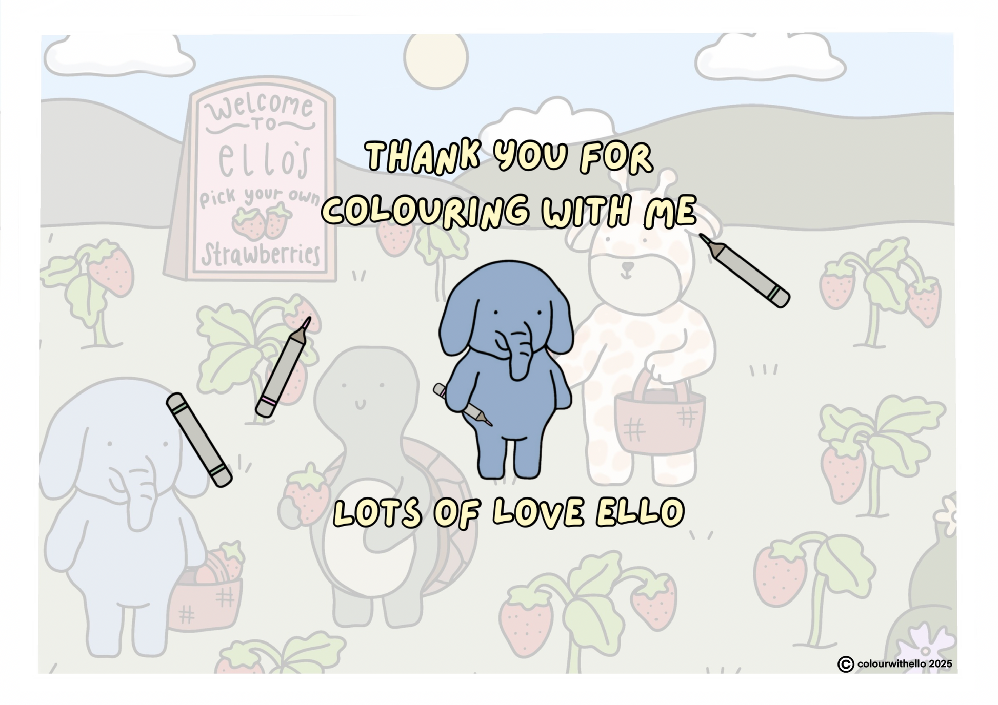 Join Ello the elephant, Gerry the giraffe, and Terry the tortoise on a delightful summer adventure in this beautifully hand-illustrated 20-page colouring book, ready to print and colour.